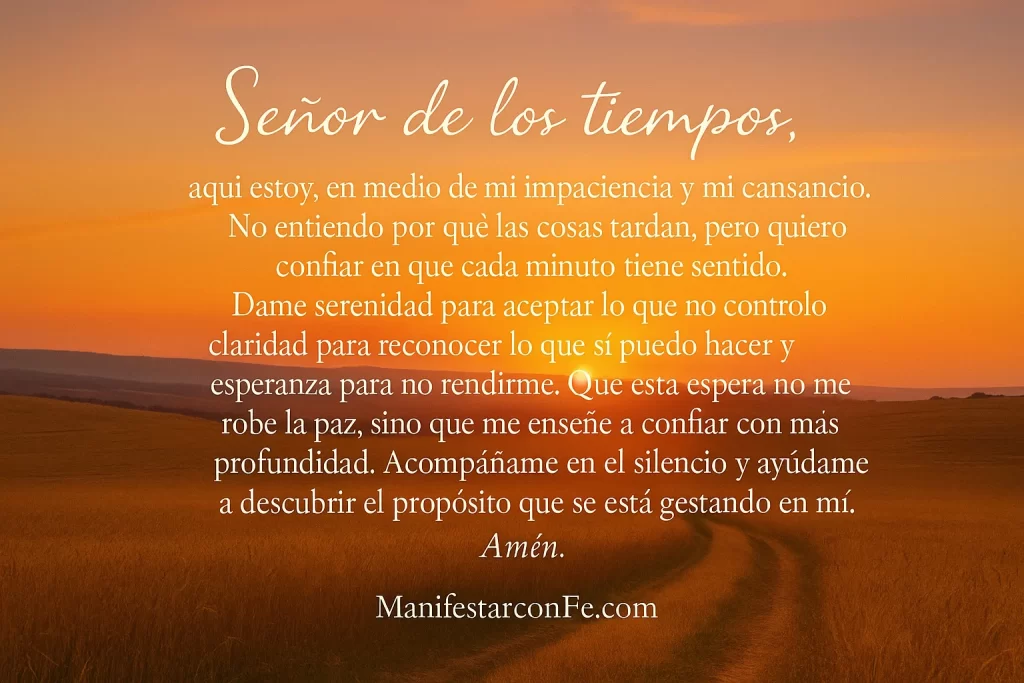 Señor de los tiempos, aquí estoy, en medio de mi impaciencia y mi cansancio. No entiendo por qué las cosas tardan, pero quiero confiar en que cada minuto tiene sentido. Dame serenidad para aceptar lo que no controlo, claridad para reconocer lo que sí puedo hacer y esperanza para no rendirme. Que esta espera no me robe la paz, sino que me enseñe a confiar con más profundidad. Acompáñame en el silencio y ayúdame a descubrir el propósito que se está gestando en mí. Amén.
